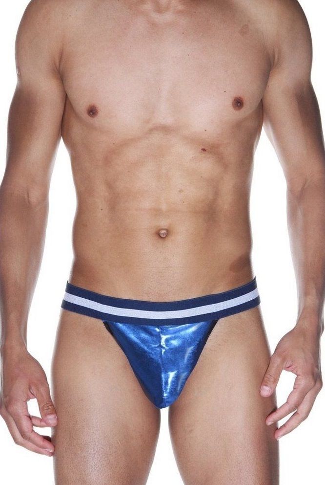 Блестящие мужские гладкие трусы-тонги насыщенного синего цвета, на широкой резинке в полоску.