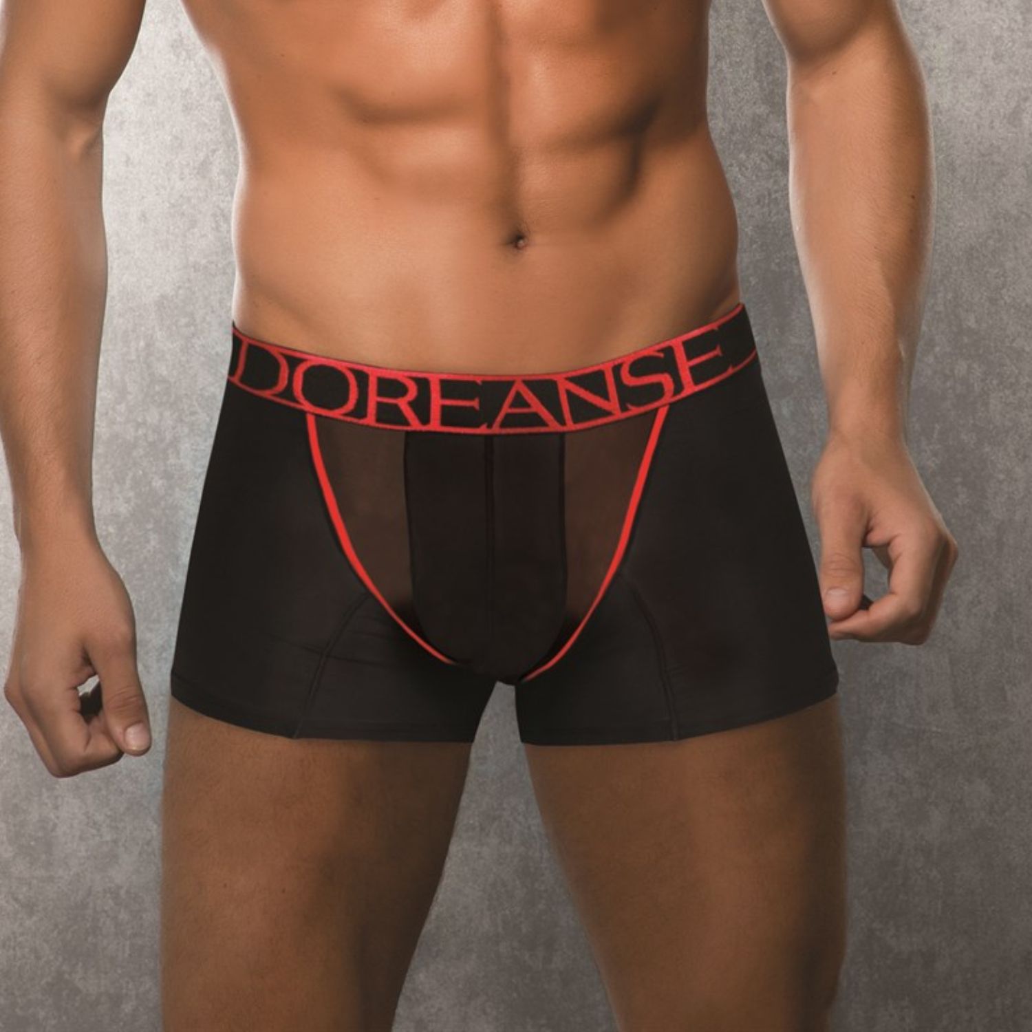 Мужские облегающие трусы-боксеры из тончайшего и легчайшего, почти невесомого шелковистого материала. Передняя панель однослойная, без подкладки, по краям декорирована интригующе-прозрачной сеточкой и ярко-красным кантом. На поясе пришивная резинка с ярко-красным фирменным логотипом бренда «Doreanse».
