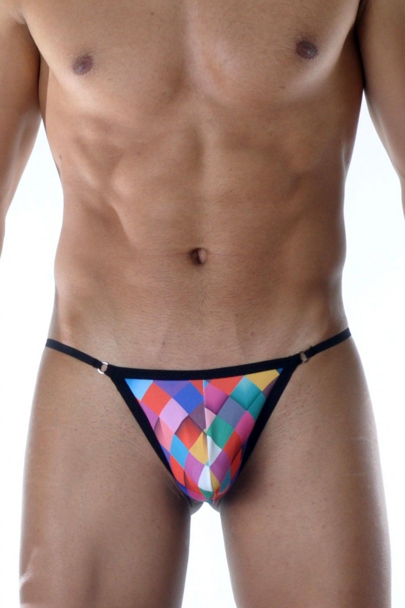 Сексуальные трусы-стринги с принтом в виде цветных квадратов.