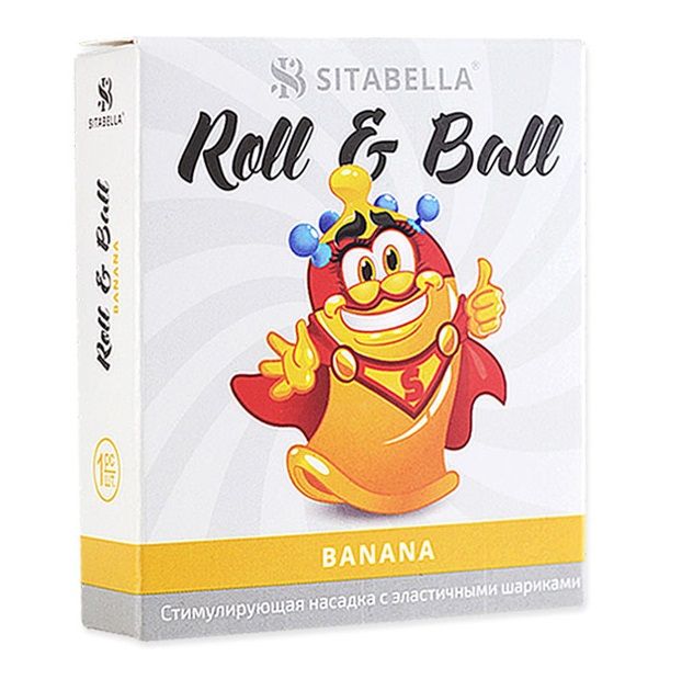 Roll & Ball – прозрачная желтая стимулирующая насадка в виде презерватива с накопителем цилиндрической формы и пятью эластичными синими шариками. Насадка покрыта силиконовой смазкой с ароматом банана, которая обеспечивает легкое и комфортное скольжение.