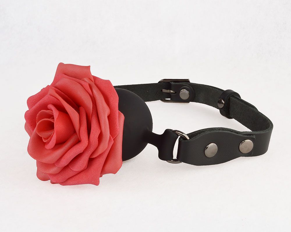 Кляп-шар изготовлен из силикона. Ремешки из натуральной кожи черного цвета. Фурнитура имеет никелевое покрытие. Роза изготовлена из фоамирана. Диаметр шара - 4,4 см.