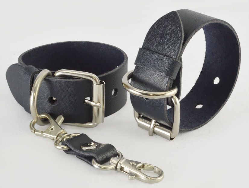 Аксессуар изготовлен из ременной кожи. Фурнитура никелированная. За счет регулирующей пряжки подойдут на любое запястье мужчин и женщин. Наручники имеют кожаную перемычку с двумя карабинами. Ширина браслетов - 2,5 см. Обхват - 14-24 см.