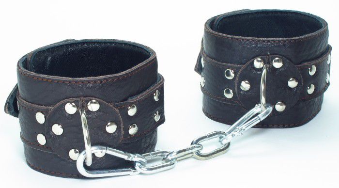 Черные кожаные наручники на металлической цепочке. Выполнены с заклепками из металла.