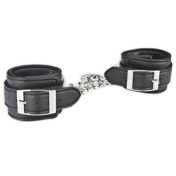 Черные оковы для запястий из суперкачественной искусственной кожи. Все швы прострочены, металлические детали надежно закреплены. Два браслета соединяются между собой металлической цепью с прочным замком. Размер браслетов регулируется ремешком. Ширина наручника - 5 см.