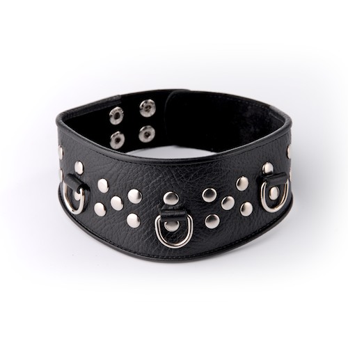 Изготовлен из натуральной кожи с велюровой подкладой. При изготовлении использована никелированная фурнитура. Размер универсальный. Один из основных атрибутов BDSM.
