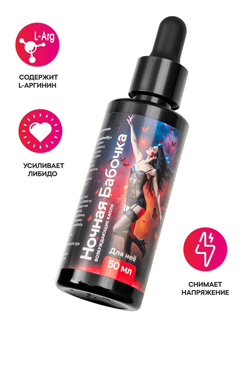 Откройте для себя новые грани наслаждения с возбуждающими каплями для женщин «Ночная бабочка». Этот продукт, созданный специально для повышения женского либидо, подарит вам незабываемые моменты страсти и удовольствия. Показания к применению: -Снижение сексуального влечения и либидо. -Сексуальная дисфункция, связанная с недостаточной возбудимостью. -Усталость, напряжение и стресс, влияющие на сексуальную активность. -Потребность в усилении ощущений и улучшении качества интимной жизни. -Профилактика и поддержание здоровья половой системы. Эффективный натуральный состав усиливает кровообращение в органах малого таза и благоприятно влияет на эпицентр женского удовольствия. Позвольте себе наслаждаться яркими и страстными моментами с «Ночная бабочка» – каплями, которые пробуждают желание и усиливают удовольствие. L-аргинин: Незаменимая аминокислота, увеличивающая уровень окиси азота в теле, что способствует повышению либидо и сексуальной активности. Экстракт корней женьшеня: Мощный стимулятор либидо, воздействующий на эндокринную систему, пробуждающий сексуальное желание и усиливающий ощущения. Экстракт ананаса: Богатый источник витаминов и минералов, нормализующий функции нервной системы и способствующий общему укреплению здоровья. Экстракт плодов черники: Природный антиоксидант, источник витаминов В1, В6, С и цинка, поддерживающий иммунитет и общее состояние организма. Экстракт клубней маки перуанской: Улучшает функционирование органов половой сферы, значительно увеличивает женское либидо. Экстракт листьев дамианы: Тонизирующий эффект, нормализация кровотока, снятие напряжения и усиление либидо. Преимущества «Ночная бабочка»: Безопасный и натуральный состав без ГМО. Быстрое действие и удобная форма выпуска. Усиление сексуального желания и улучшение качества интимной жизни. Общее укрепление организма и улучшение настроения. Противопоказания: индивидуальная непереносимость компонентов, повышенная нервная возбудимость и бессонница.