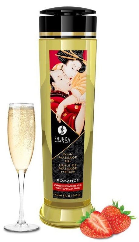 Массажное масло с ароматом клубники и шампанского Romance. 100% натуральные масла холодного отжима, с витамином Е (антиоксидант), без жирных остатков, не забивает поры, нет минерального или животного масла. Мягкость и шелковистость этого масла с приятным скользящим эффектом на коже вызывает ощущение полного восторга. Сексуальное желание нарастает и вы готовы к любви. Получите взаимное удовольствие от чувственного эротического массажа с использованием нашей эксклюзивной смеси масел холодного отжима, тщательно отобранных за свои стимулирующие и придающие энергию свойства. Масло легко скользит по коже, не оставляя жирных ощущений, в то время как различные экзотические ароматы поднимут ваши чувства до вершин возбуждения. Идеально подходит для того, чтобы насладиться расслабляющим массажем или сделать его, совместив с обволакивающими обольстительными ласками. Это на 100 % натуральное масло с упоительным ароматом, легко скользит по коже, не оставляя жирной пленки. Запах массажному маслу придают эфирные масла и отдушки, что в отличие от большей части другой продукции SHUNGA, ароматизированной вкусовыми добавками, делает его несъедобным.